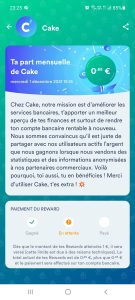 - Chaque mois vous recevez votre part Cake. Sorte de récompenses que l’application vous verse. Il s’agit d’une part de leurs bénéfices qui sont versés à chaque utilisateur.