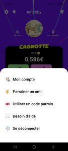 Ce code est à rentrer après l’inscription. Rendez-vous dans l’onglet « cagnotte » puis cliquez sur la roue dentelée en haut à gauche pour voir l’option « utiliser un code parrain ».