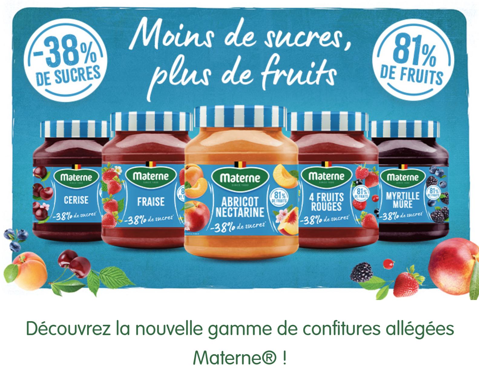 Achetez une Confiture Materne allégée (Fraise, Nectarine-Abricot, 4 fruits rouges, Ceries, Myrtille-mûre) chez Delhaize