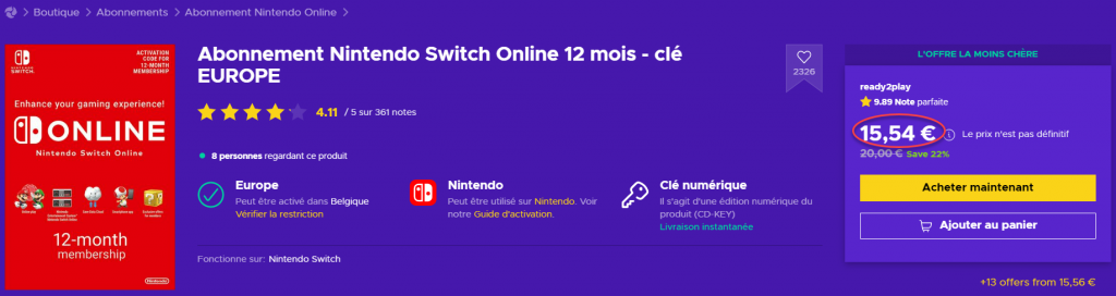 Switch-online 12 mois Europe disponible à 15,14€ au moment de la publication de cet article